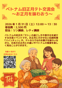 1/31 sat OPEN☆ ベトナム旧正月テト交流会~お正月を味わおう~ ベトナムの旧正月「テト」の過ごし方や食文化を紹介する交流イベントです。お正月に欠かせない伝統料理「バインチュン」や、テトならではのお菓子を味わい […]